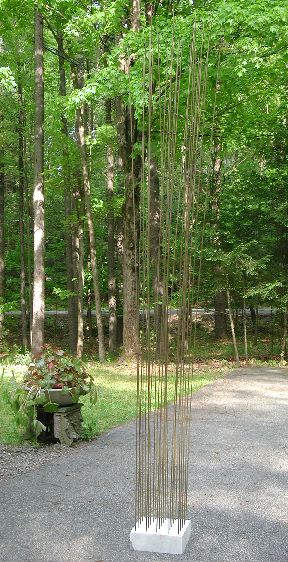 This simple vertical sculpture is interactive with the wind and can withstand gusts to 50 mph. Made with 25 hollow brass tubes the interplay of the brass creates a wind chime effect.